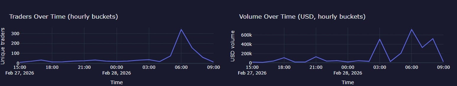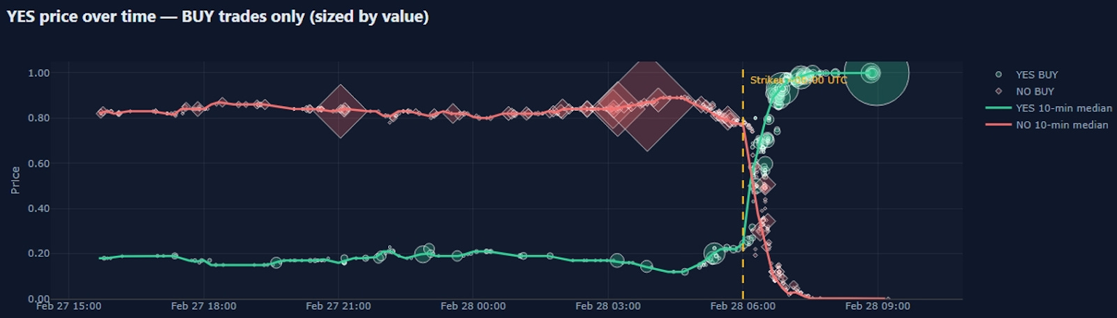 In the Iran strike markets, price movements told only part of the story. Timing told the rest. Around 11:30 PM EST on February 27th, we observed a clustering of heavy, high-conviction “Yes” bets.