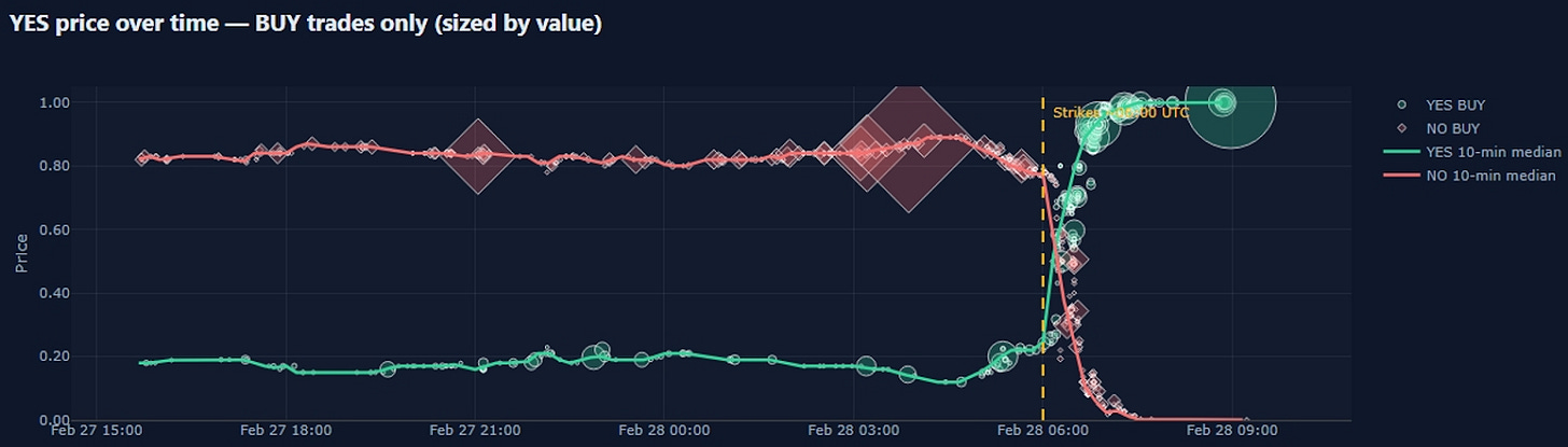 For weeks, traders and observers watched markets asking whether and when the United States would act. Prices oscillated through multiple false starts. Then, around 11:30PM EST the evening before the strike, relevant Iran markets began climbing sharply. Public confirmation did not begin circulating until approximately 1:15AM on February 28.