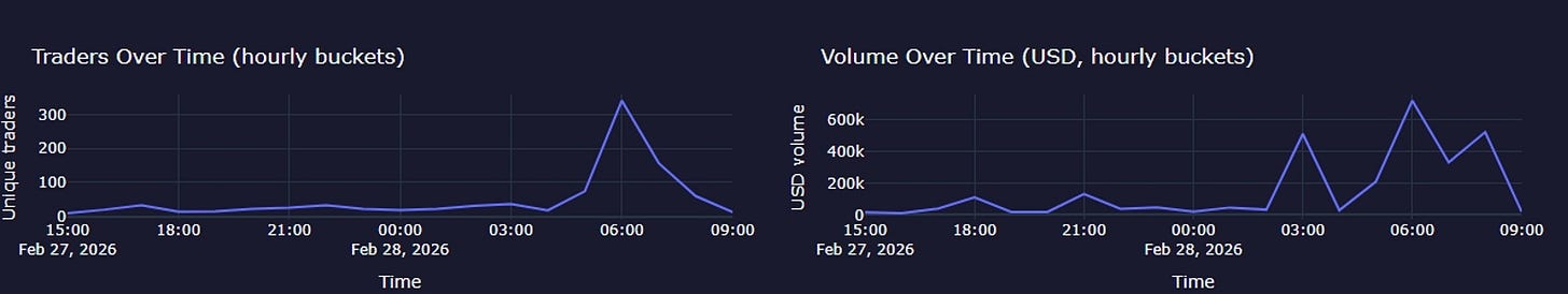 Screenshot from our own internal tool showing the timing of the volume of # of traders and the money volume for these Iran strike markets.