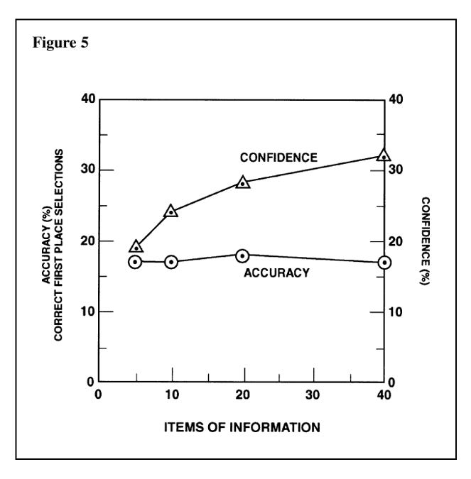The structural weakness of relying on confidence is famously documented in intelligence analysis. Chapter 5 of The Psychology of Intelligence Analysis shows that as analysts receive more information, their confidence in their conclusions often rises sharply, while their actual accuracy barely moves.